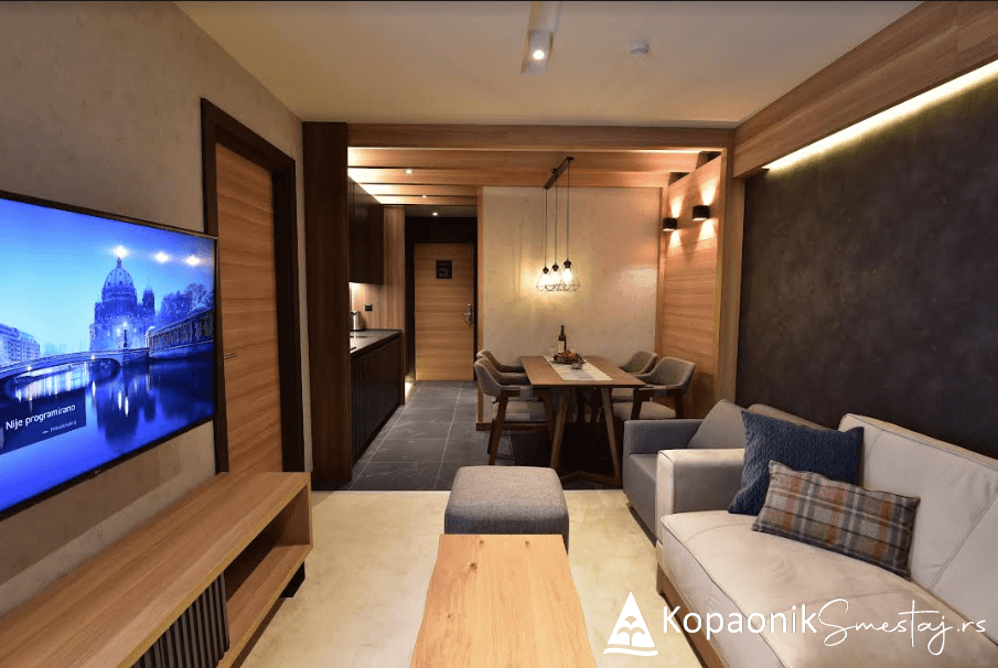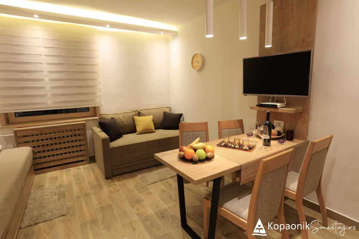 Moderni planinski studio apartman u delu nekadašnjeg hotela Angella u Konacima namenjen je smeštaju od 1 do 4 osobe i čine ga dva single ležaja i jedna garnitura na razvlačenje za dve osobe, kompletno opremljena kuhinja sa trpezarijom i kupatilo sa tuš kabinom i ostalim neophodnim sadržajem (peškiri, fen, sušač za garderobu). Gostima je na raspolaganju besplatan WI-FI internet kao i TV sa kablovskim kanalima.